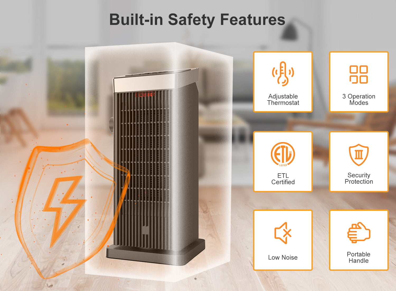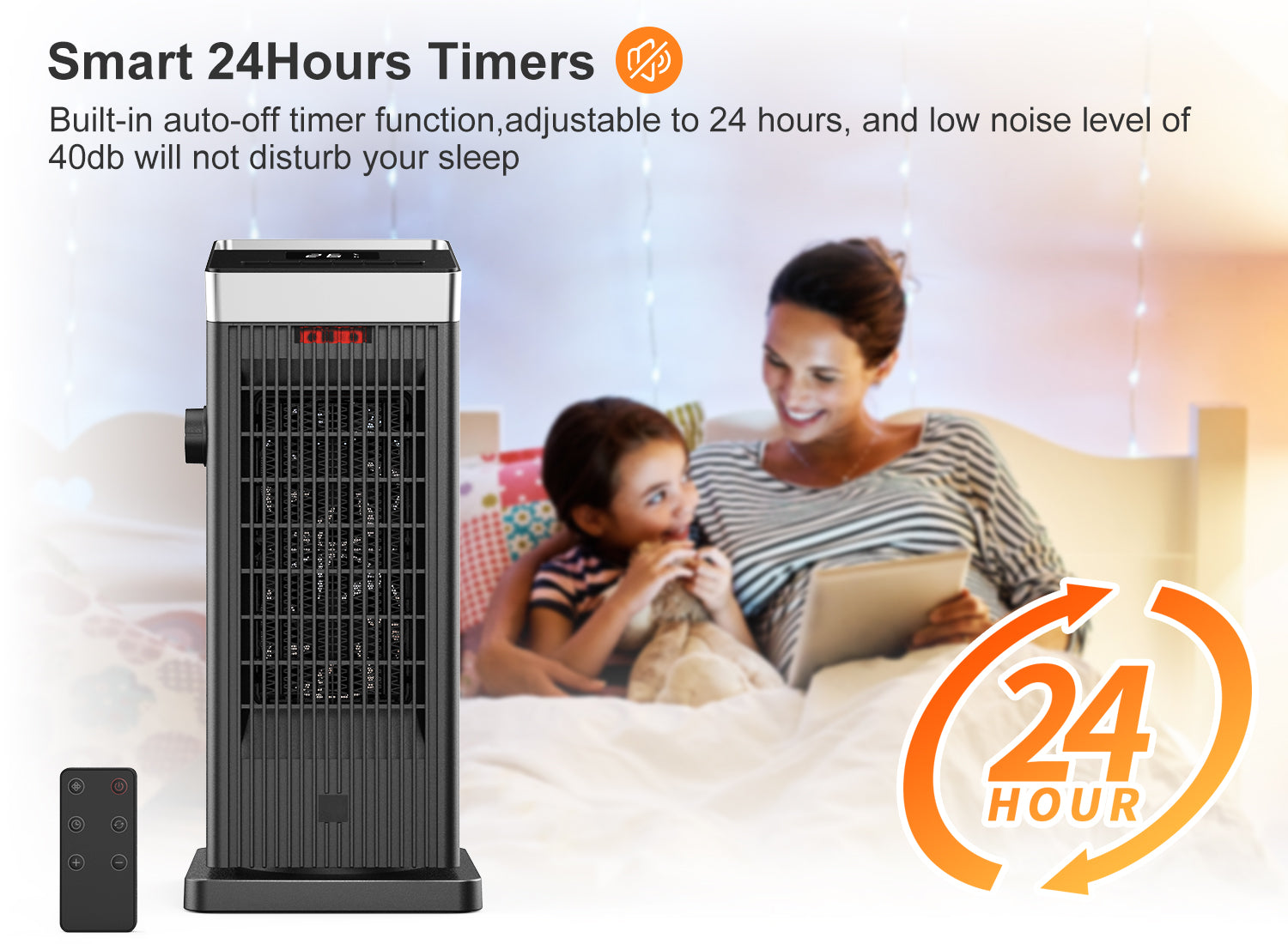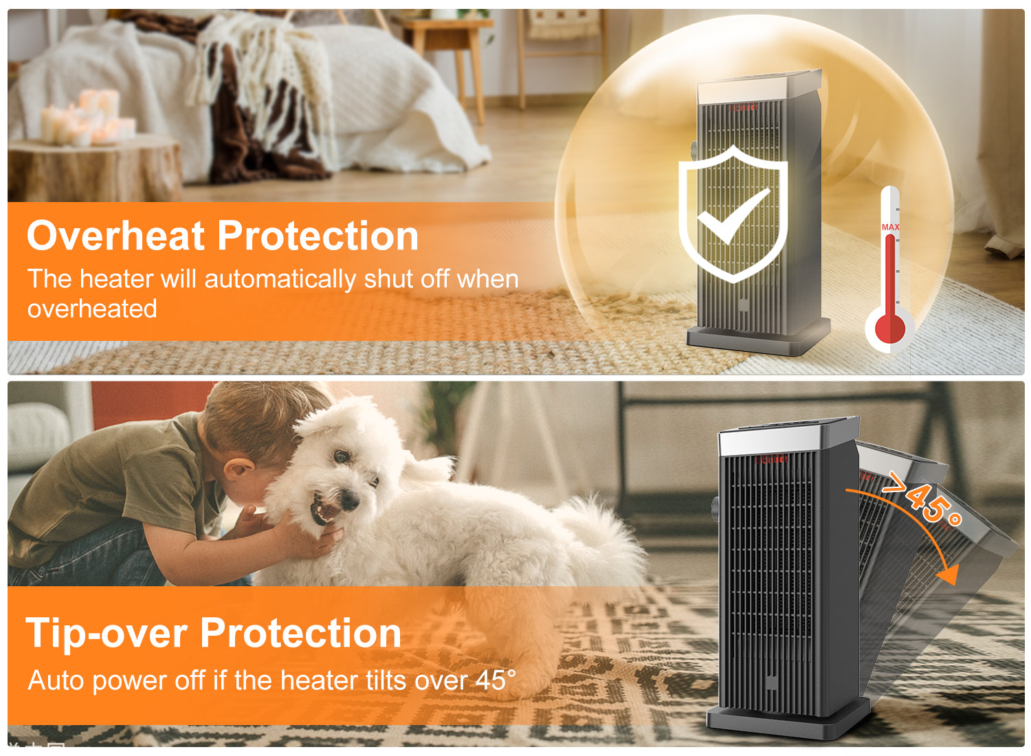 Multiples Safety Features: Space heaters for indoor uses safety V-0 flame retardant material, features with 24H auto-off, built-in overheat protection and tip-over safety switch, When space heater is knocked down accidentally by kids or pets or the sensor detect ceramic temp over-heat, it will automatically turn-off power to protect your family.