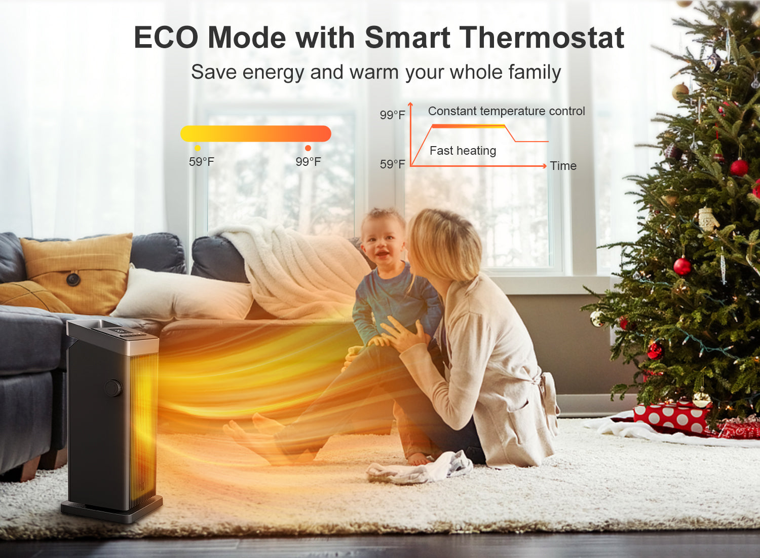 Energy-Saving ECO Mode & 4 Modes: The energy efficient portable heater with thermostat is equipped with temperature setting 55℉- 99℉. It will automatically stop heating and enter in standby when the ambient temperature is higher than the set temperature. ECO function optimizes energy consumption and minimize your energy bill.