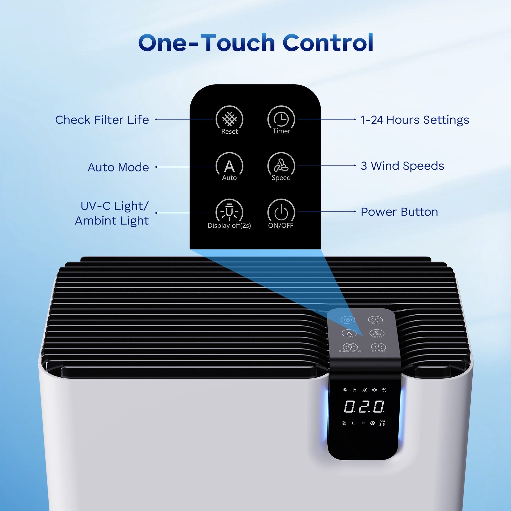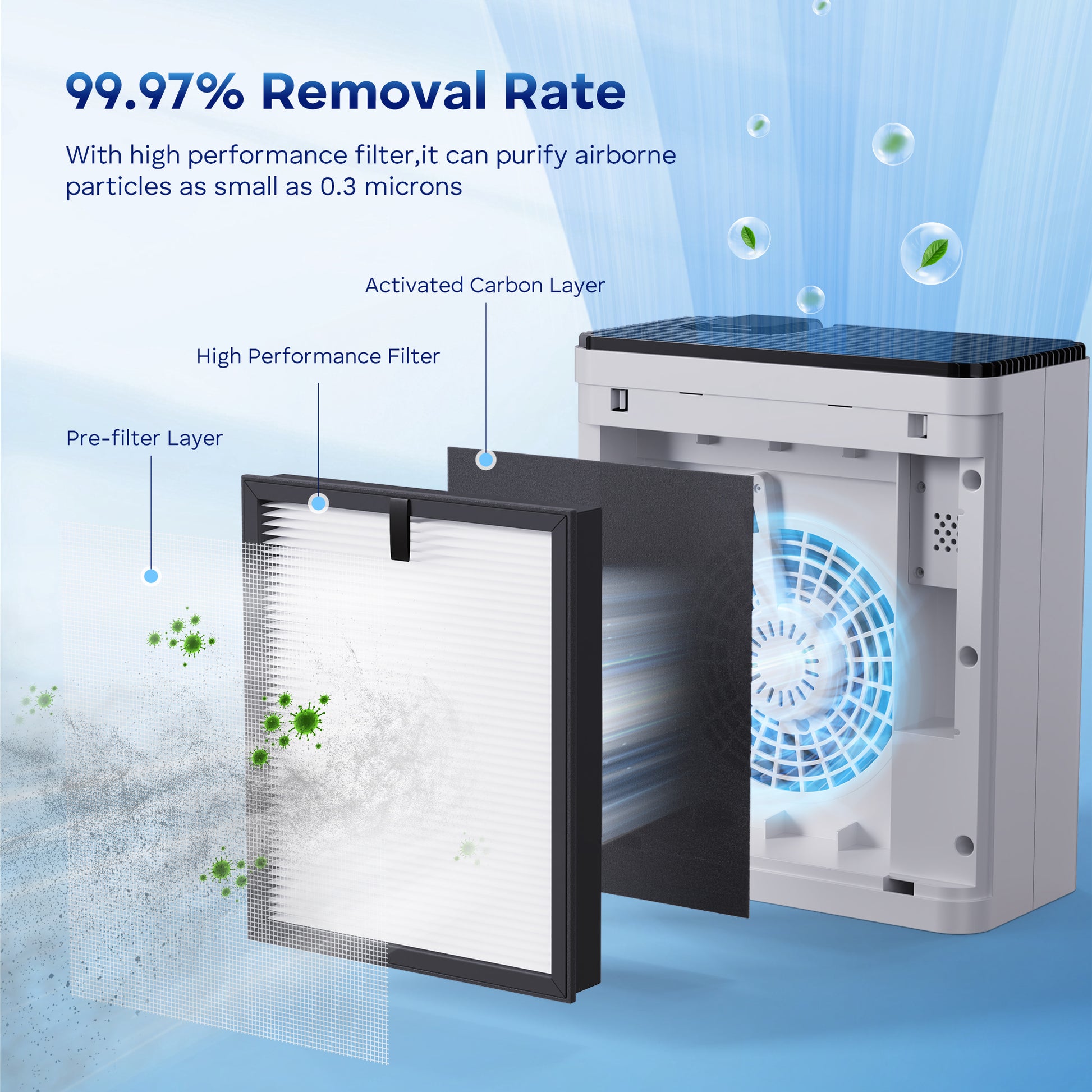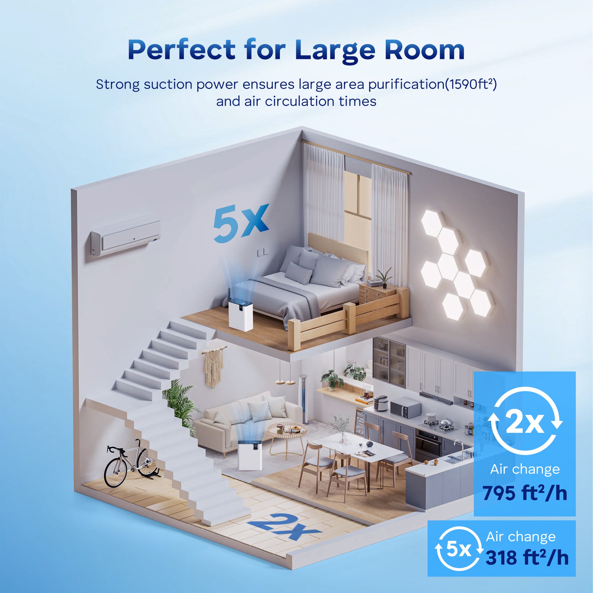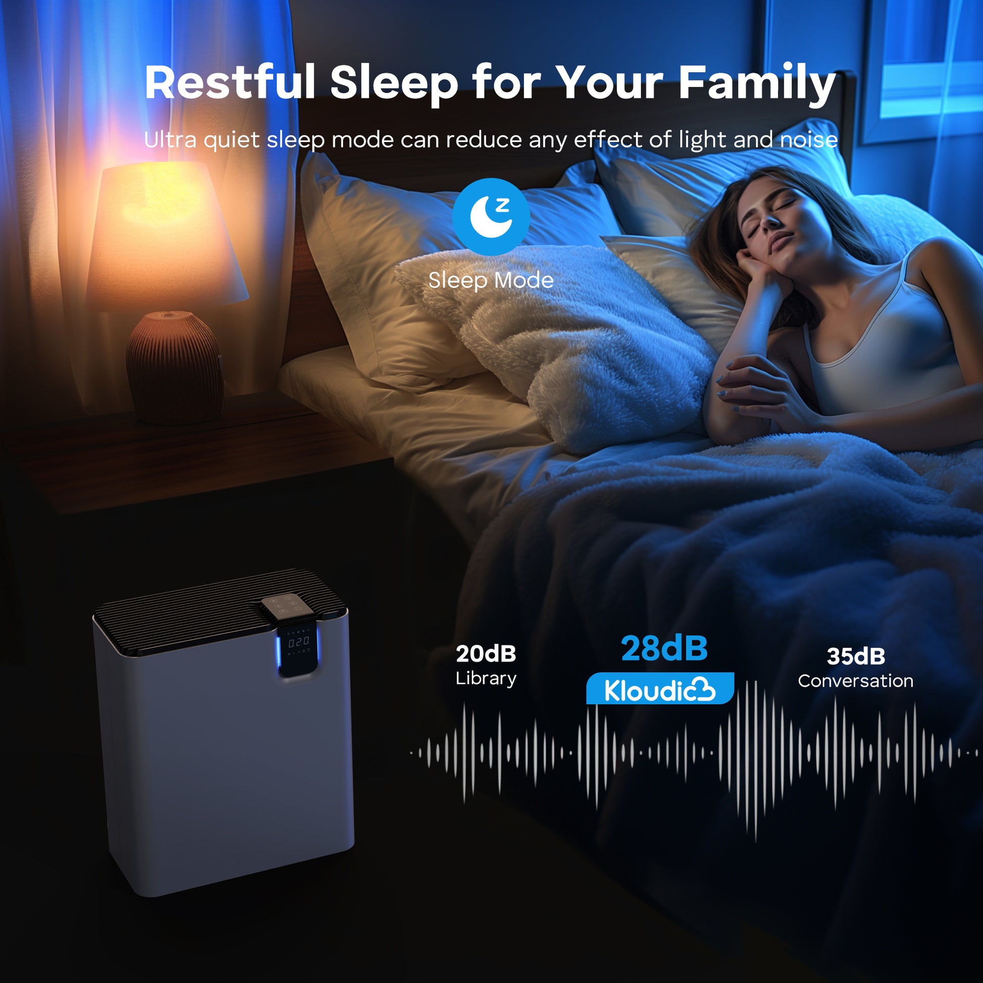 Wide Coverage】Kloudic smart air cleaner coverage area up to 1590 sq. ft., 1 time per hour; 318 sq. ft., 5 times per hour, perfect air purifiesr for bedrooms, offices, kitchens and living rooms. 【Air Quality Display & Smart Auto Mode】JH05 air purifier monitors real-time air quality with a PM2.5 sensor, displaying accurate readings. In Auto Mode, it adjusts speed based on air quality, speeding up when needed to maintain a healthy environment while saving energy." 【H13 True HEPA Filter】The 3-layer system includes a pre-filter, H13 HEPA filter, and activated carbon filter, capturing 99.97% of particles as small as 0.3 microns. Effectively filters dust, pollen, pet dander, and odors, while the carbon layer absorbs VOCs. 【UV Dual Purification】Our air purifier for large room has a built-in UV module, which can further eliminate the harmful substance in the air and suppress their development inside the machine and filter cartridge(short press ?? botton). 【Silent Sleep Mode】With a 28dB ultra-quiet mode, the air purifier operates at low speed and dims display lights, ensuring undisturbed, restful sleep while providing clean, fresh air upon waking. 【24-Hrs Timer & 3 Level Fan Speed】The air purifier offers 3 fan speeds (including sleep mode) for different room sizes. Set the timer for automatic shutoff or let it run 24/7, continuously providing fresh air.