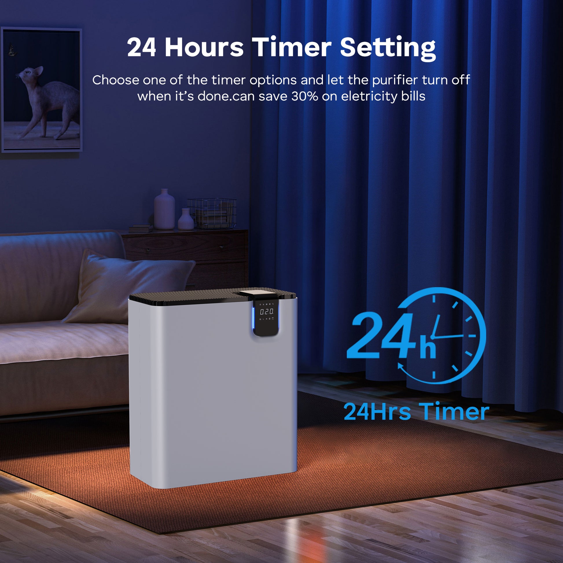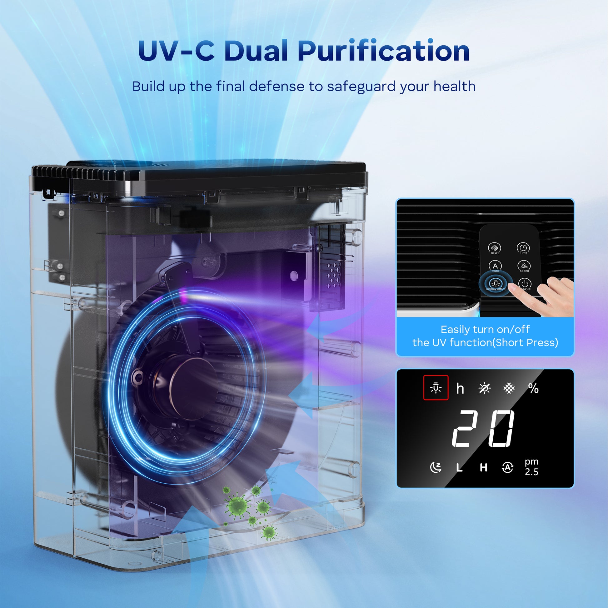 - 3 Stage Filtration System: Pre-filter, an H13 HEPA filter, and an activated carbon filter. Real-Time Air Quality Monitoring. Smart Sensor. Smart Auto Mode UV Dual Purification Sleep Mode&Display off Air Quality Indicator. 24-Hrs Timer. 3 Fan Speed. Check Filter Indicator. Does not meet California requirements: Cannot be shipped to California